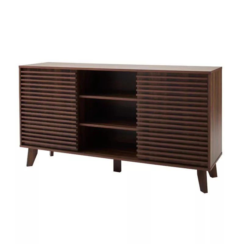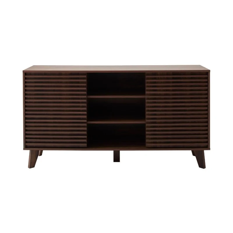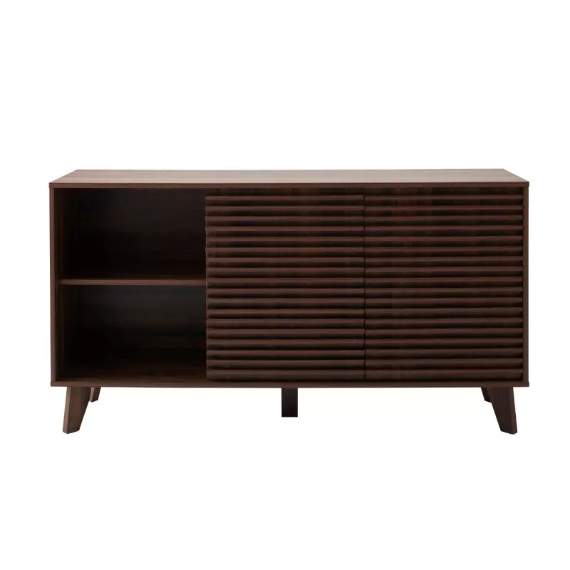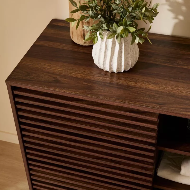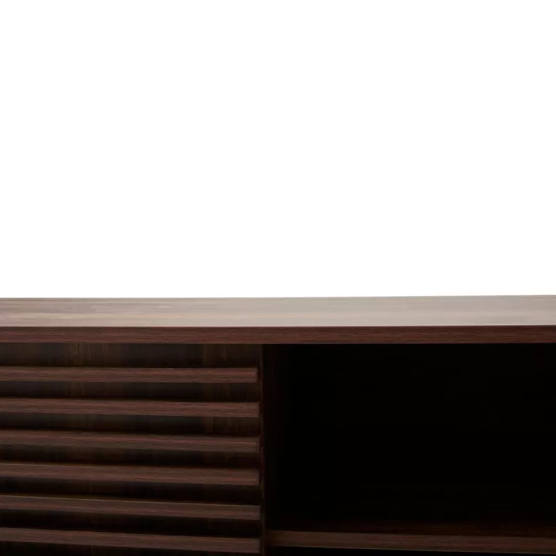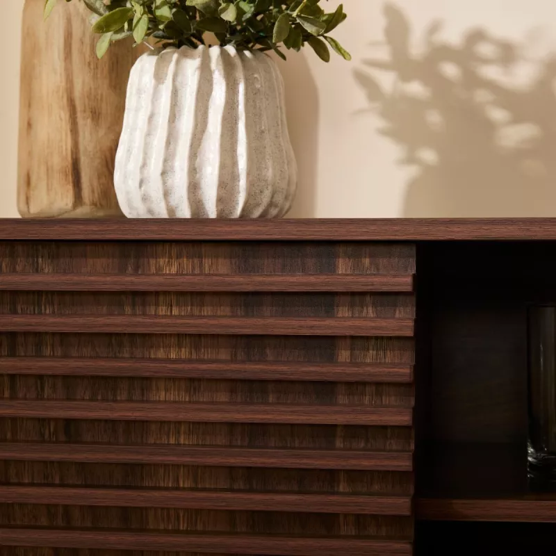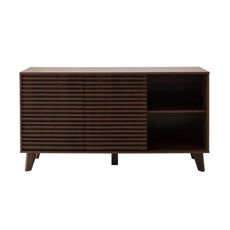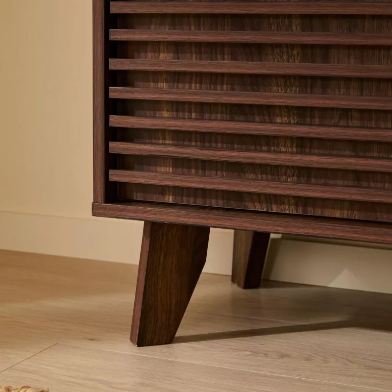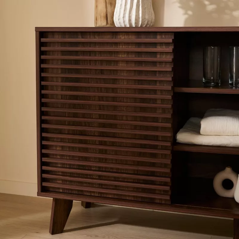 Apportez élégance et fonctionnalité à votre intérieur avec ce buffet au style moderne et raffiné. Son décor bois noyer foncé et ses façades rainurées créent une atmosphère chaleureuse et contemporaine, idéale pour le salon, la salle à manger ou l’entrée.