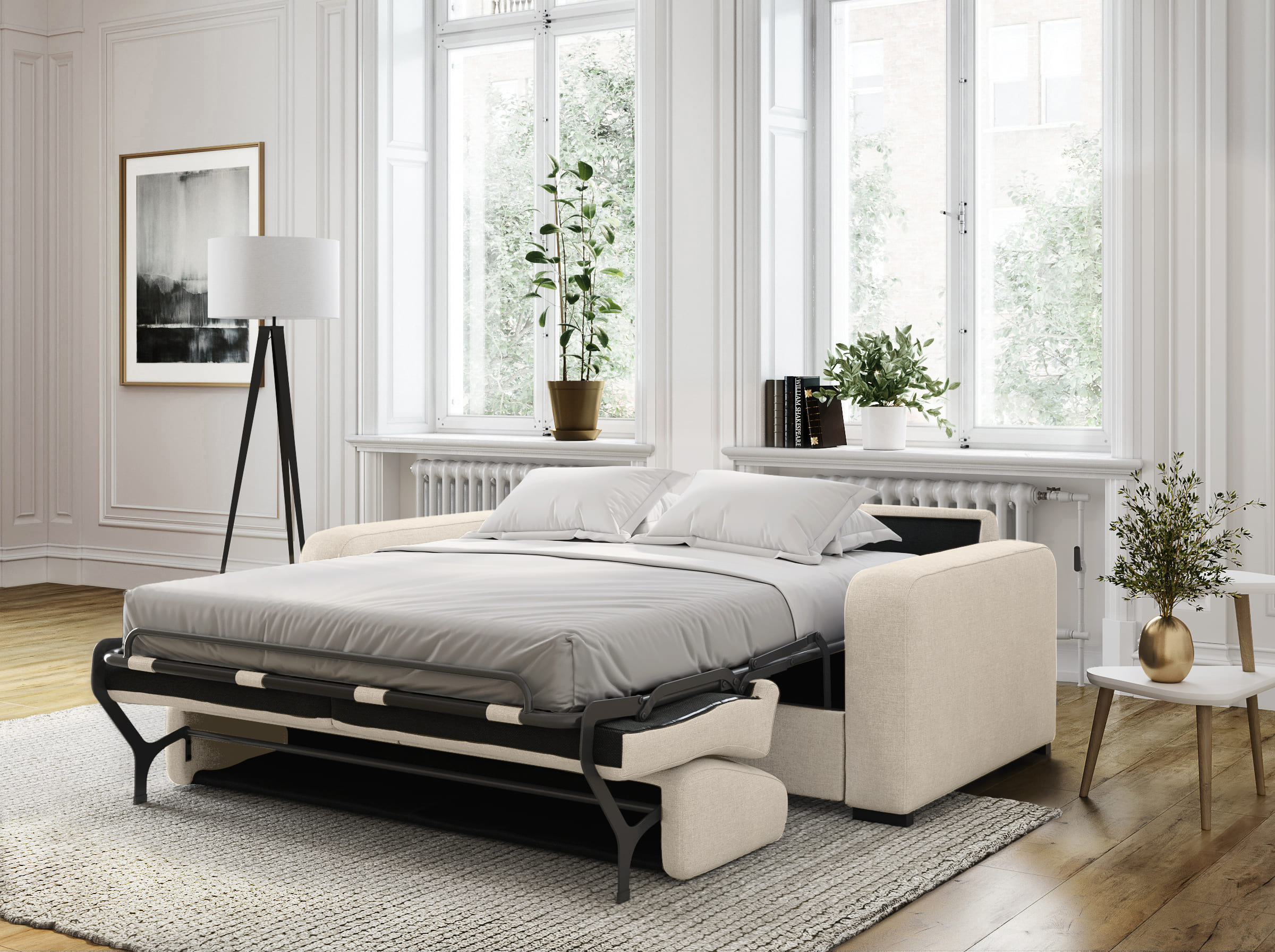 Véritable canapé lit couchage express, renferme un vrai matelas de 140 x 190 cm. Son épaisseur de 14 cm vous garantit un grand confort, pour un couchage régulier comme pour un couchage d’appoint. Avec son système d’ouverture rapide, la mise en place de la position lit se fait en quelques secondes seulement. Grâce à son pratique mécanisme d’ouverture, vous n’avez pas besoin de retirer les coussins de dossier ou d’assise, tout reste en place pour un usage simplifié. Très pratique, le canapé couchage rapide dispose d’un rangement pour couette et oreillers à l’arrière du dossier.