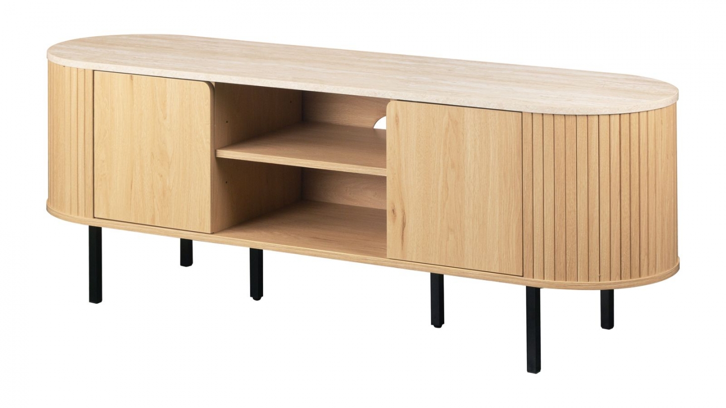 • Meuble au design arrondi. Finitions latérales avec baguettes effet chêne. Plateau supérieur effet travertin.