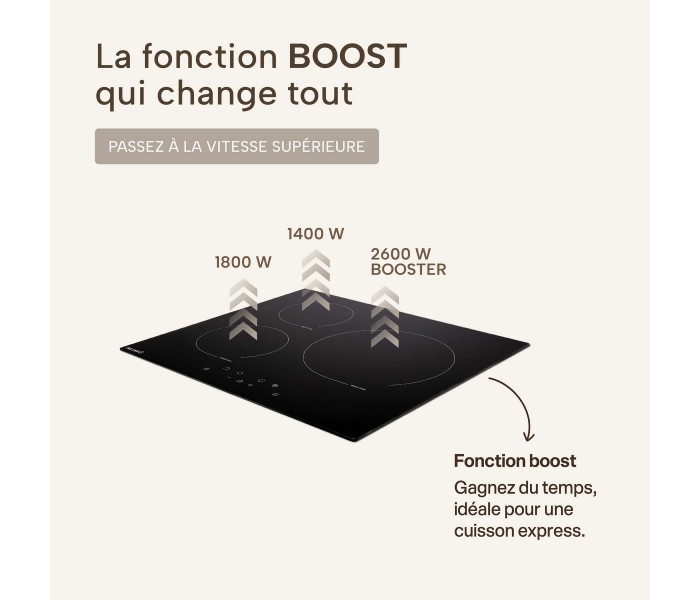 Notre plaque dispose de la fonction booster. La mise en chauffe de l’induction est rapide, mais si vous avez besoin de monter encore plus vite à sa puissance maximale, le booster vous comblera.